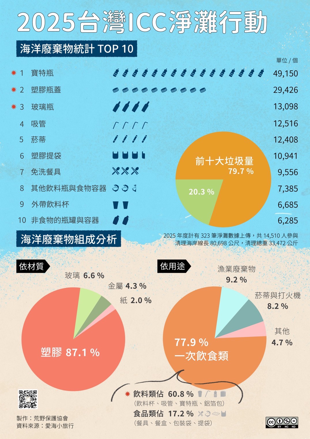 本會自2003年起,長期於全台各地執行淨灘,並以ICC表格紀錄廢棄物品項及數量。每年分析下來的數據顯示,瓶蓋或寶特瓶自2016年以來都是前一、二名,2024年寶特瓶數47,606個,2023年67,076個,且數量通常比第三名還高出至少一倍。