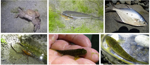 上左:細足扁平蟹,上中:烏魚,上右:斐氏鯧鰺,下左:沼蝦,下中:日本瓢鰭鰕虎,下右:曙首厚唇鯊