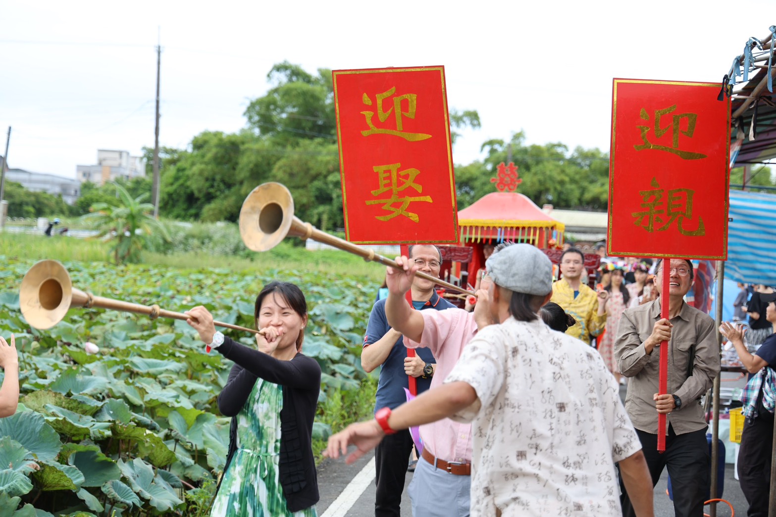 7 月 26 日這一天,天空厚重,一整週已有三個颱風在太平洋上徘徊不去,風雨如約又忽來忽去。然而午後的成興大池,仍迎來一艘緩緩駛出的鴨母船。船上沒有貨物,載著的是娶路雞、迎親的親人,一如往昔的婚禮行列,在水道上緩緩前行,也載著村人對平安與豐收的願望。