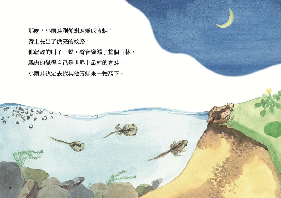 我希望透過牠來鼓勵所有閱讀的小朋友:即使個子小,也能找到屬於自己的亮點與力量,然後呢,如果你繼續向前努力,你也可以變成很棒的自己,就像小雨蛙發出響亮的鳴叫聲一樣。