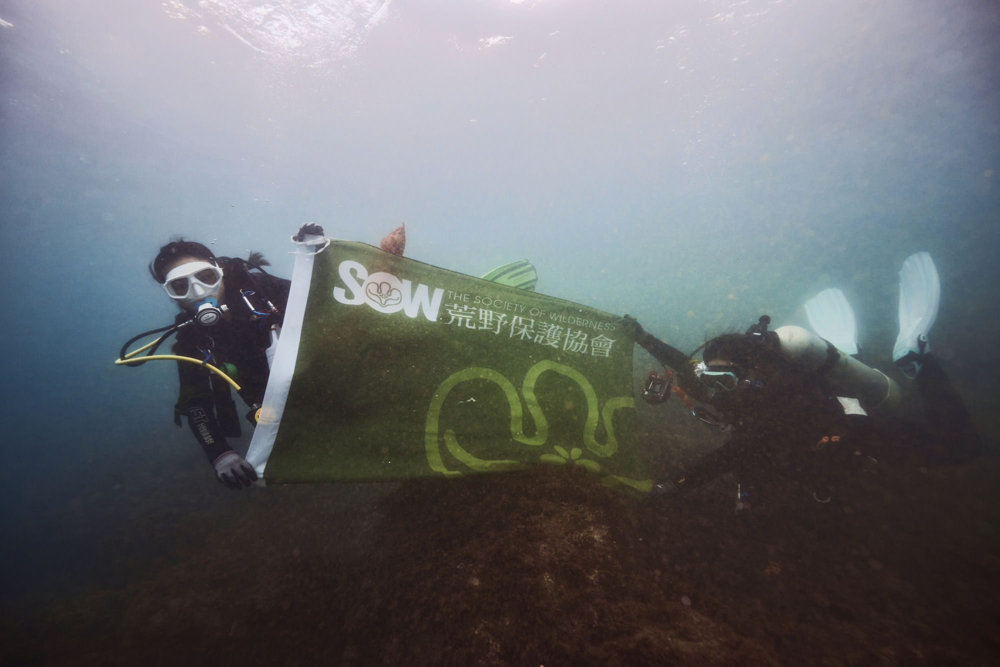 ▲水肺組在海中展開荒野旗幟留念