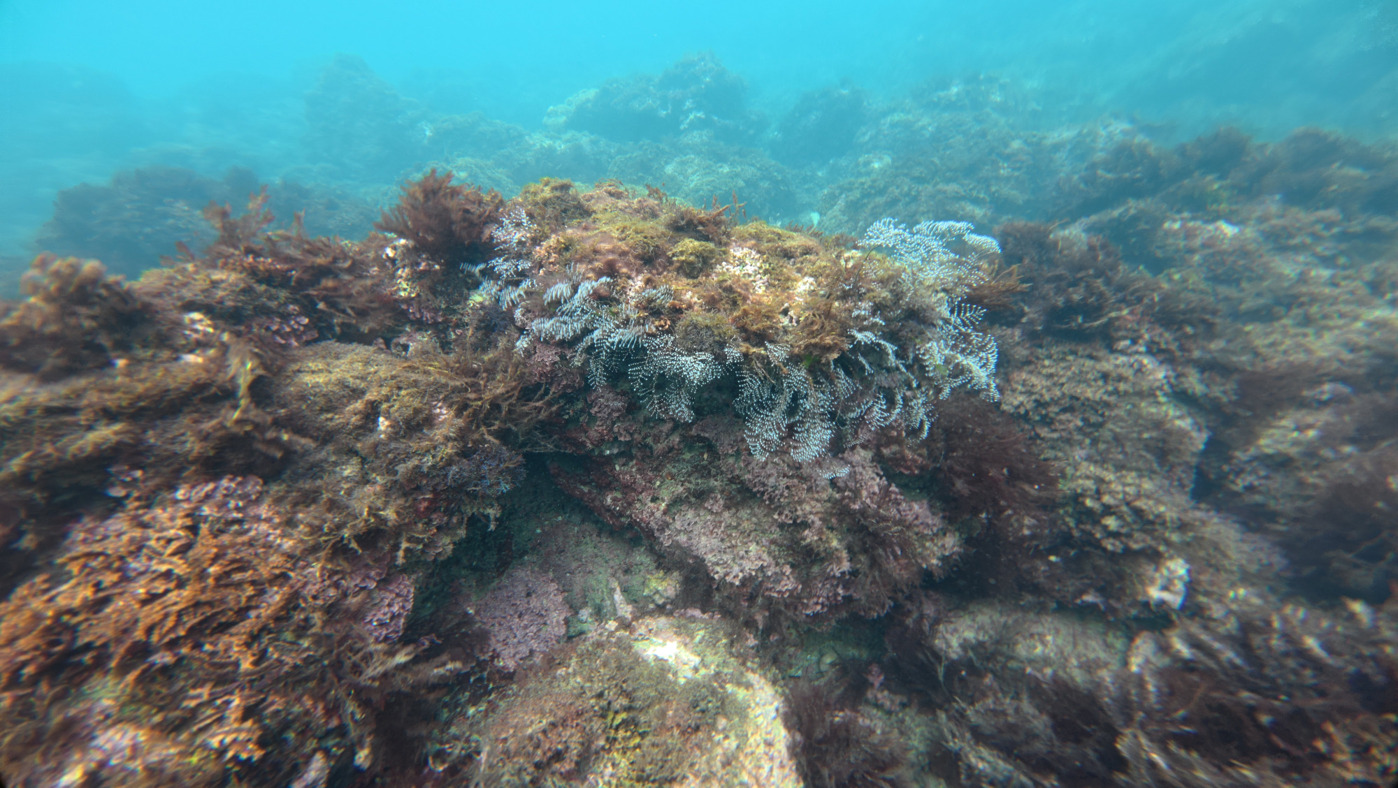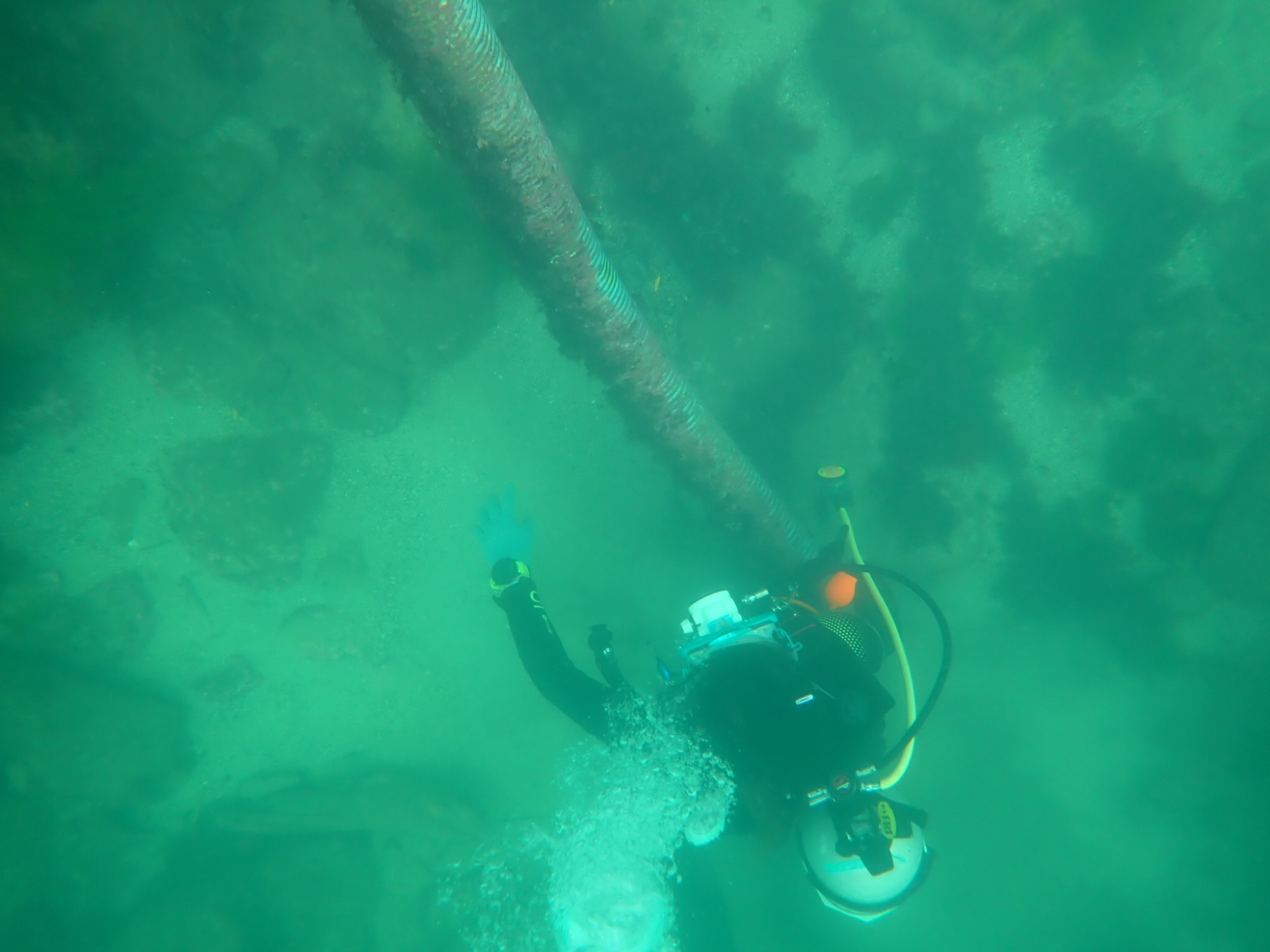 附著於這些大型水管上的海洋生物,為東北角常出現的石蓴、麒麟菜、石花菜以及其他紅藻類,也觀察到有些許螺類的卵,疑似黑千手螺。多種類藻類並存在代表水質具一定清潔度與光照穿透性,而發現螺類卵顯示此處適合物種繁衍。