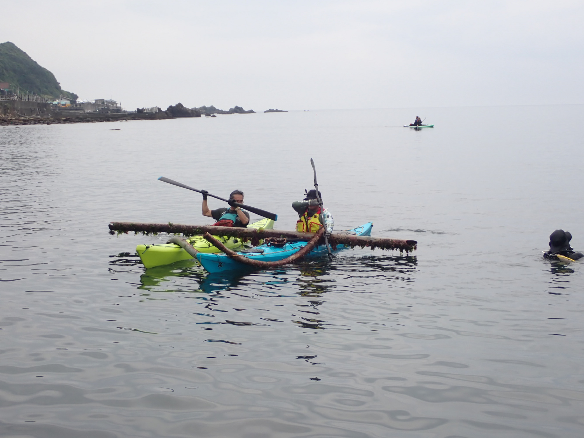 今天又再次看見整個團隊合作無間的默契和力量。潛水員用浮力袋將超長廢管打上水面,兩艘獨木舟加上兩條SUP五人合力拔河,依然無法將廢管拉上舟板,請自潛潛水員下水察看,發現廢管底部還卡在海底,隨即派立槳將帶著潛水刀的自潛潛水員從岸邊拖至作業區協助切割,最終順利將廢管分段運回岸上。