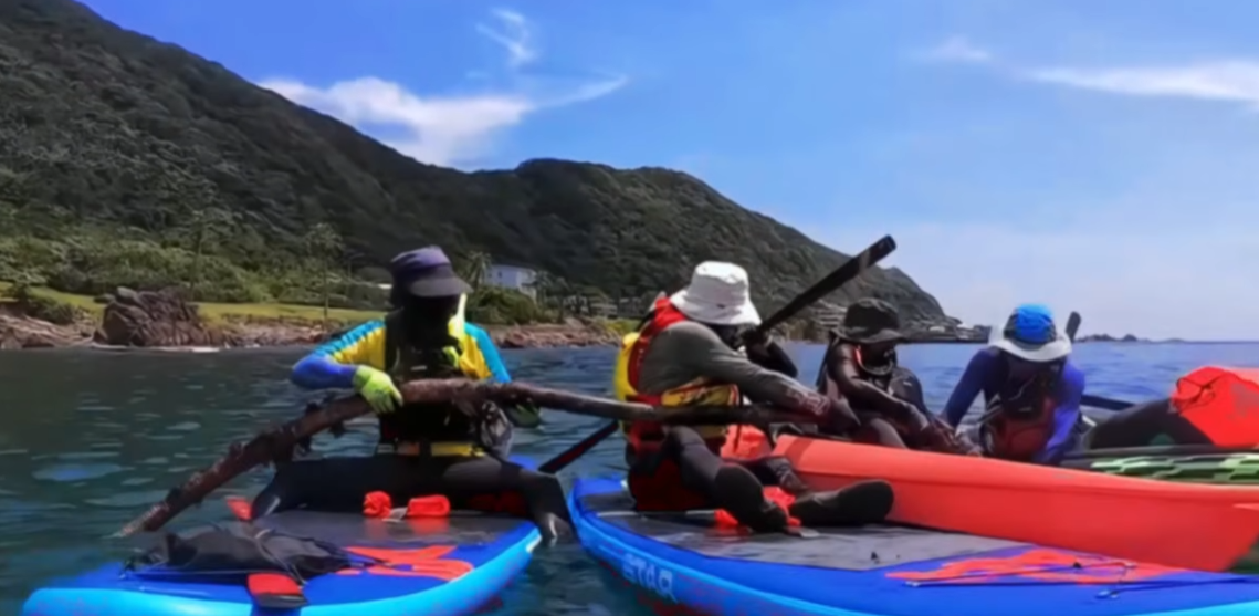 獨木舟組是荒野淨海行動中最特別也最關鍵的組別之一,他們是台灣獨木舟推廣協會的夥伴,在淨海過程中擔任連接大海與陸地的橋樑,從海中第一線的潛水員手中接獲海洋廢棄物後,再將這些廢棄物搬運至陸地,交由岸上夥伴接手。而用獨木舟(或SUP)搬運海廢是什麼樣的過程呢?