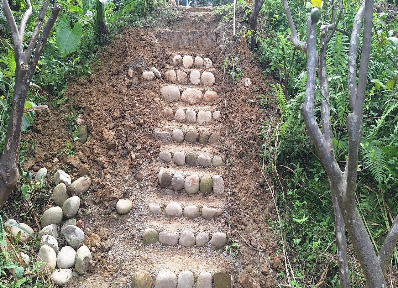 2025 年 9 月,我們在柑橘園推動生態池教育,並在上下台地間開闢砌石階梯,與新竹親子團一起完成。10 月舉行全國親子團長訓時,大家繼續補完尚未施作的階梯。