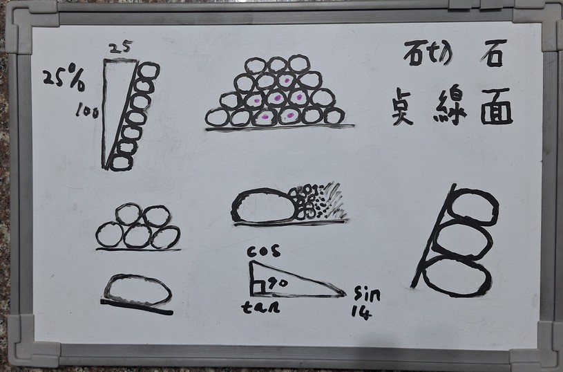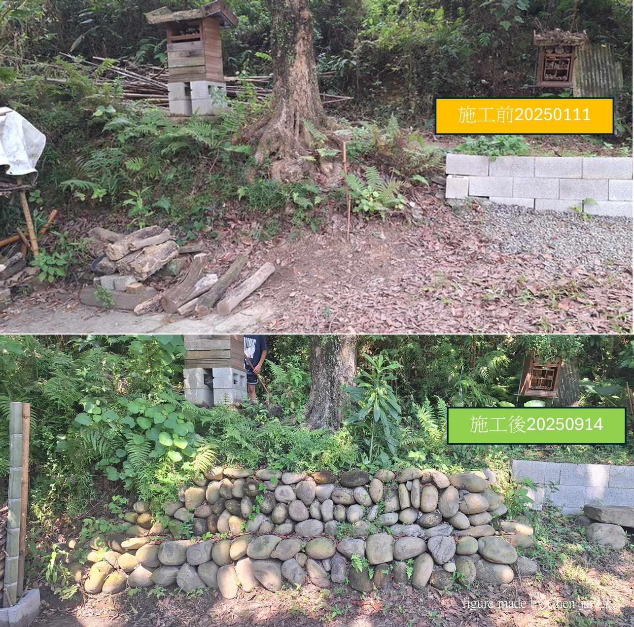 不到兩週,石材竟全數備妥,新竹分會的夥伴動能十分驚人。2025 年元旦,我們帶著桃步一期組長先行場勘,並在 1 月中旬開工、2 月完成收尾。護坡共砌六層,高 1 公尺、長 3.4 公尺,共使用 127 顆石頭。