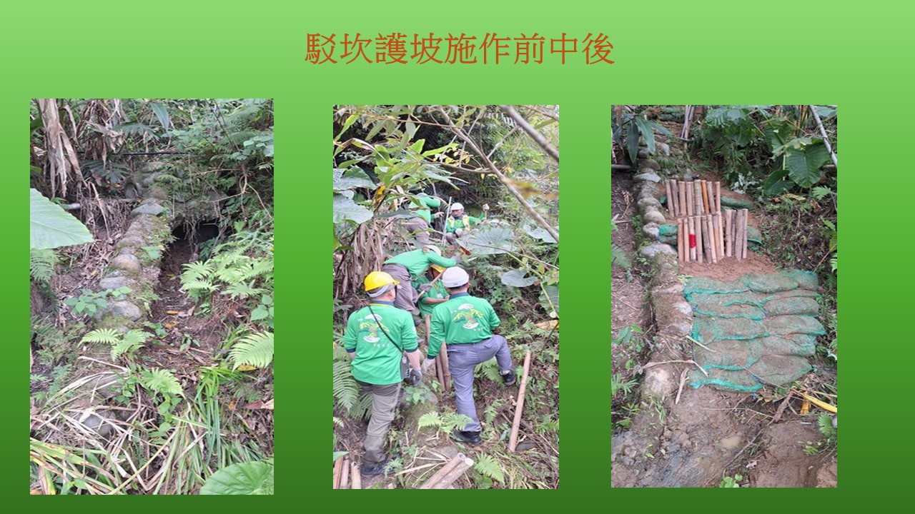 我們與棟哥討論後,決定以填土與竹子立樁製作節制壩護坡。工區尺寸達 3.1 × 1.1 公尺、深 0.4~1.5 公尺,另外還需往內掏空 1 × 0.8 × 1.5 公尺做穩固。最終建置了兩排竹子節制壩,並填入 5.1 公噸土方。這是大崙尾山與福州山都遇不到的高張力工程!也因此,當天所有學員全數順利結業——這樣的挑戰,不畢業都難。