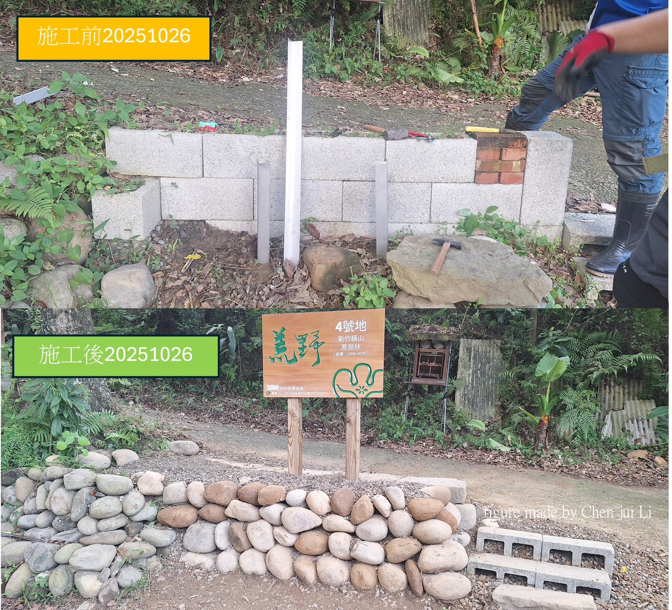 下午最熱鬧的活動,是兩個人一組抬著「4 號地立牌」四處「試拍定位」,幾乎把園區繞了一圈。最後選定的地點在龍眼樹下。由於該位置不是天然地基,我們以 1 公尺白鐵角鋼打入 0.6 公尺,再與立柱固定 0.4 公尺,最後以砌石護坡擠壓固定。10 月 26 日,「荒野四號地」的立牌正式落腳。揭牌不只是儀式,而是新的起點。