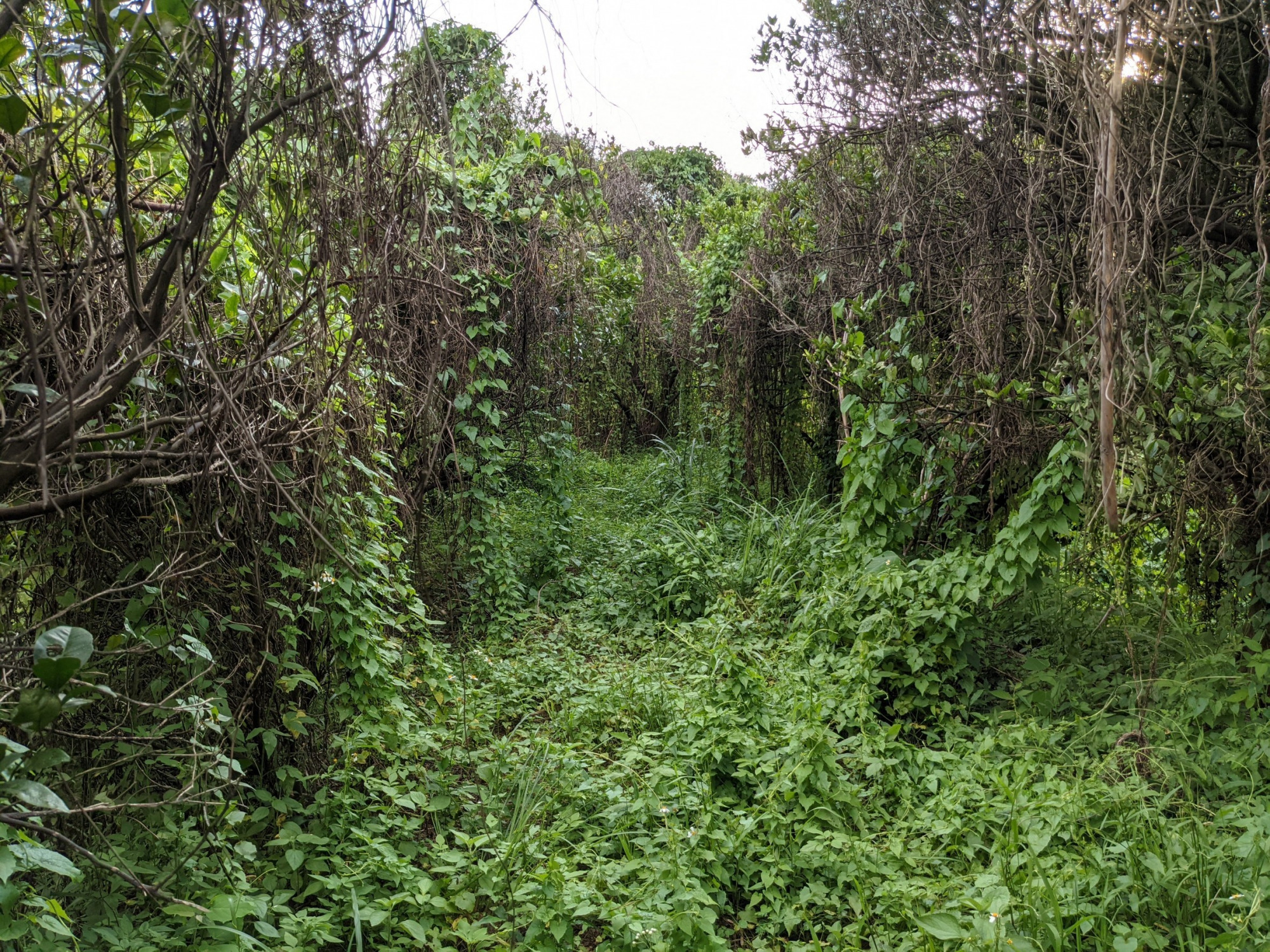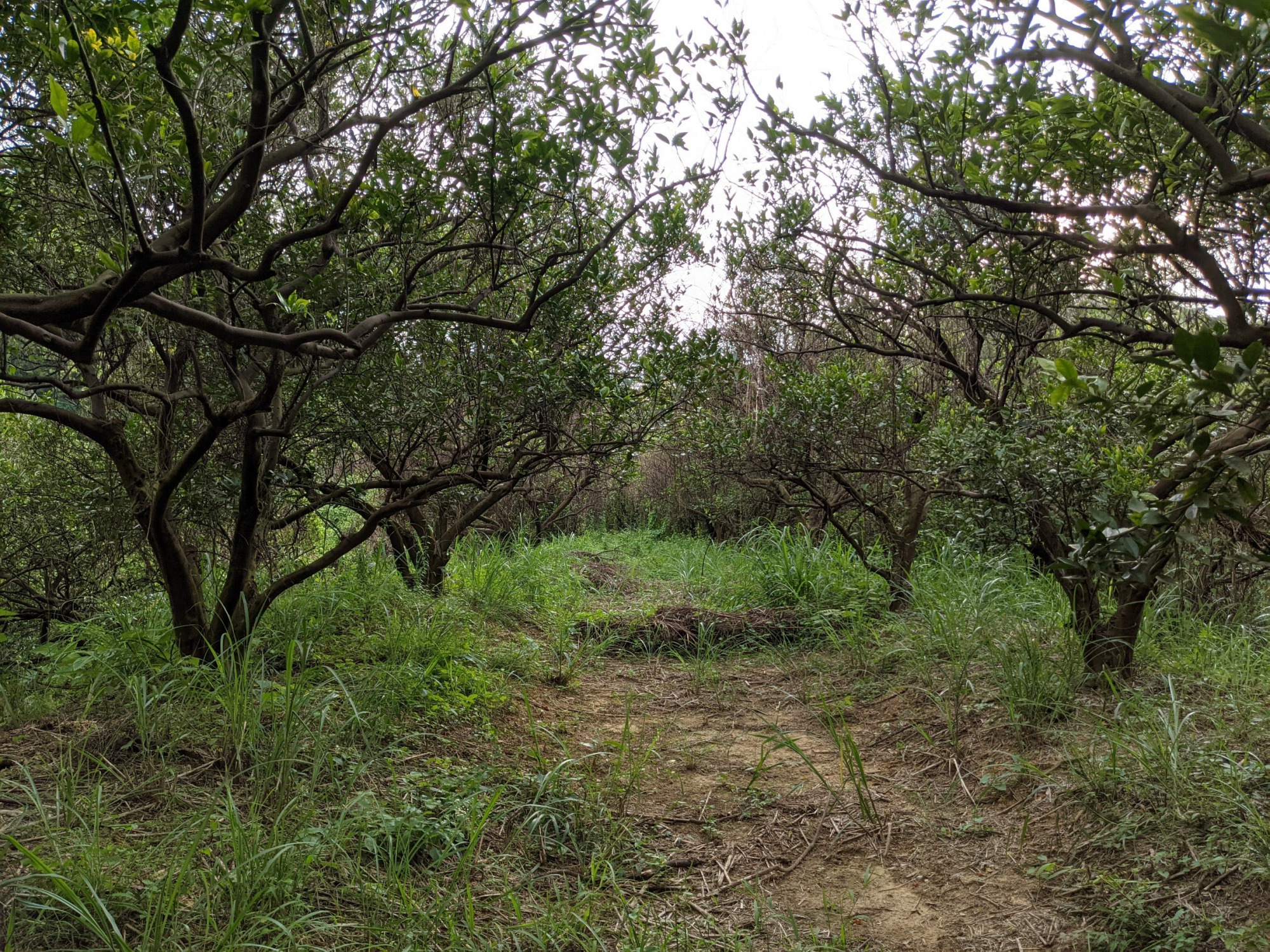 由於柑橘園多年未整理,小花蔓澤蘭恣意蔓延,宛如群魔亂舞、綠色洪流般迅速攀附在橘樹上,遮蔽陽光,壓迫原生植物的生存空間。藤蔓如魔爪般伸展,讓整片果園陷入暗影,生態平衡岌岌可危。經過二十多次的除蔓大行動,大家體會到它的驚人威力,有如「傑克與魔豆」的魔樹,一瞬間便竄上天際。每一次親手清理,更讓我們深刻體會到這個生態殺手「綠癌」的破壞力。