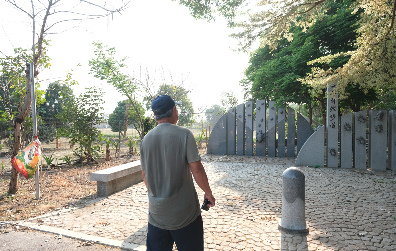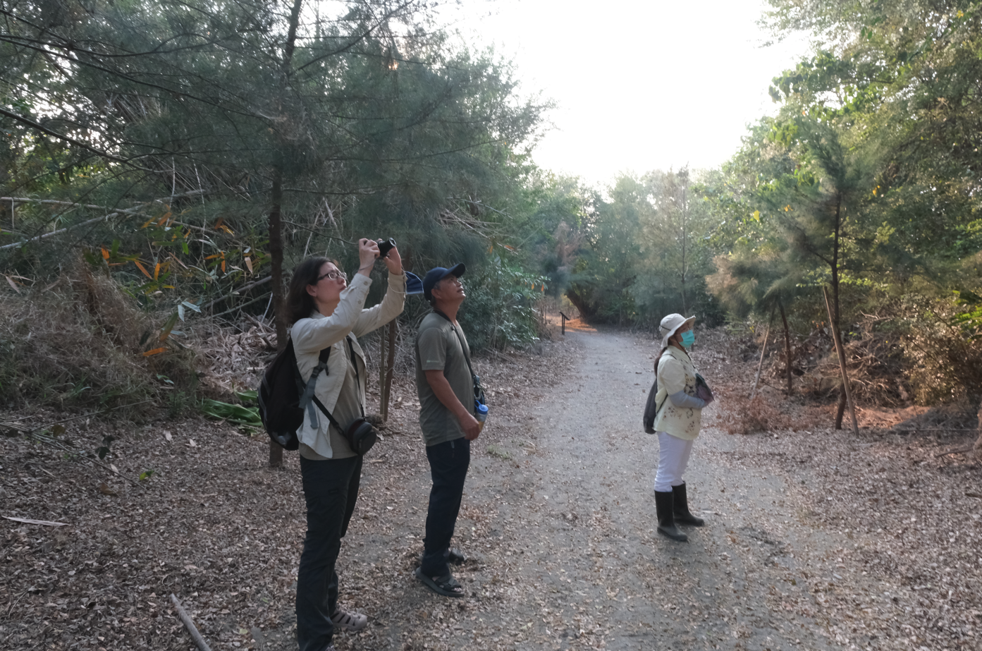 二崙自然步道在經植林規劃後,成為綠意盎然的生態水岸園區。在看了步道末端的水生植物後,血藤又帶我們去看在附近高壓電塔上築巢的東方白鸛,此時的他終於拿出這天不曾出場的相機,在夕陽餘暉中拍攝。望著天空中的東方白鸛及黑翅鳶、還有血藤無比熱愛物種的身影,今天我們對記錄的了解與收穫,比物種知識的收穫更多呢。