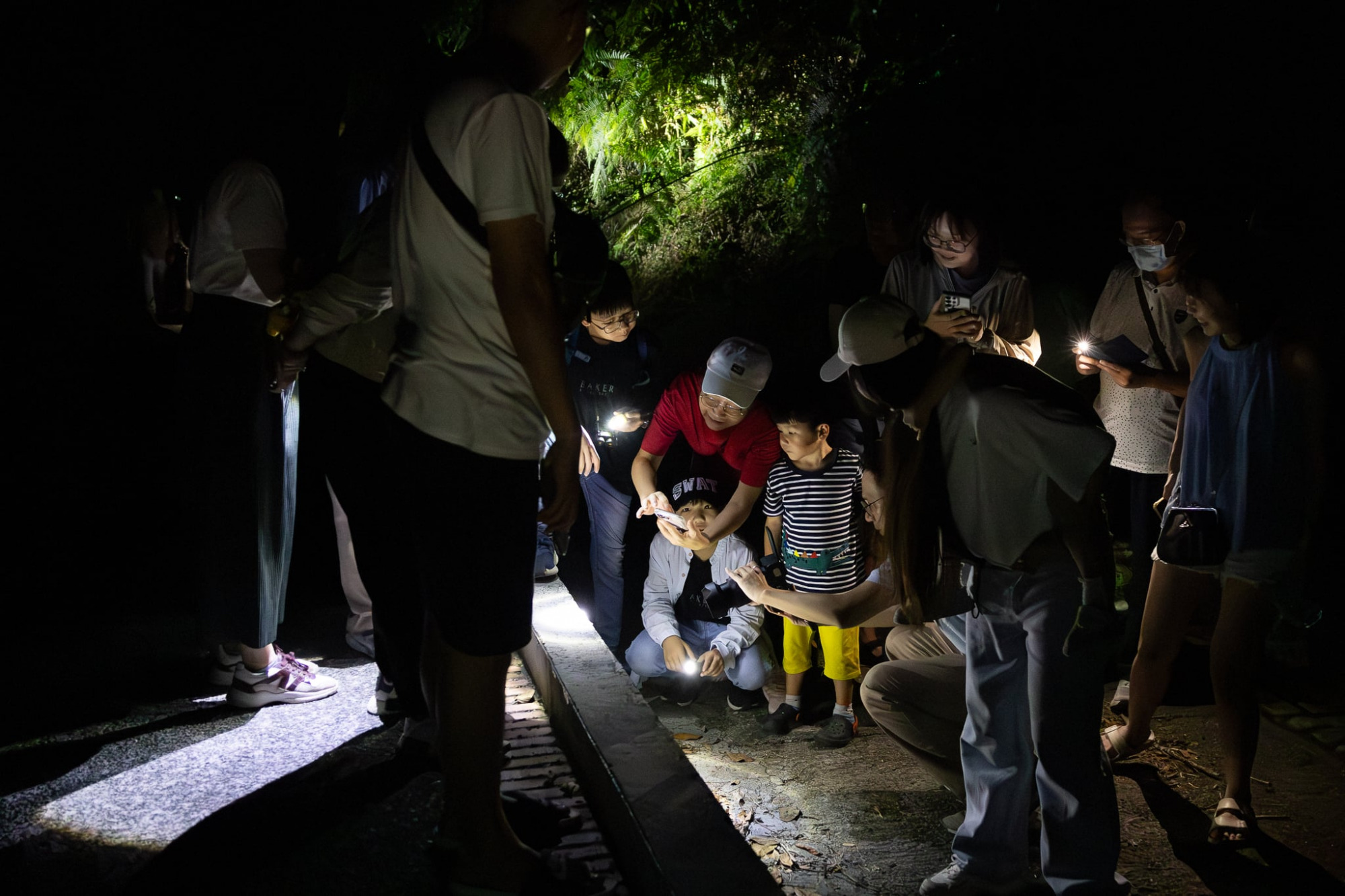 在另⼀處⽔池邊,⼀條⾚尾青⽵絲靜靜伏守在⽯頭上,⼀動也不動,銳利的眼神緊盯著⽔⾯,耐⼼等待著毫無防備的獵物⾃投羅網,好來上⼀頓夜間盛宴。蛇,往往是讓⼈⼼⽣畏懼的動物,也常因誤解與恐懼⽽無端喪命。此刻,解說員耐⼼地引導⼤家認識牠的特性,說明牠在⽣態系中扮演的重要⾓⾊。隨著解說的深入,眾⼈的懼意逐漸消退,取⽽代之的是好奇與讚嘆。⼈群圍攏在池邊,仔細觀察這條青⽵絲沉穩的身影,彷彿第⼀次真正看⾒牠、理解牠,⽽不只是害怕牠。