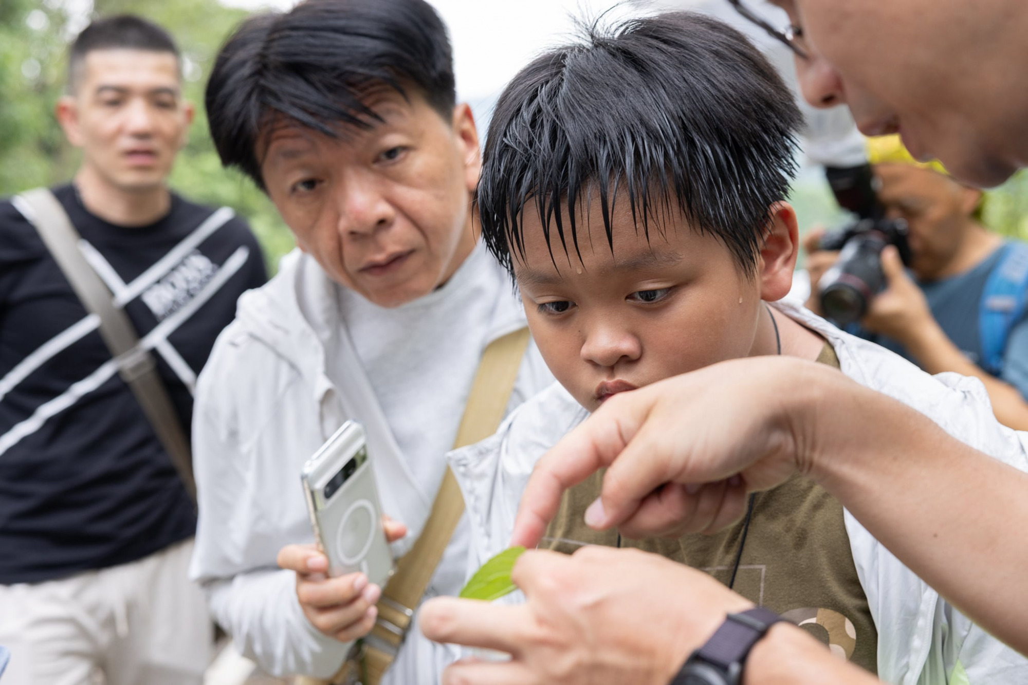 踏入步道不久,海蛇彷彿受到⼭神的指引,巧妙地⽤⼩⼩的觀察盒請來⼀隻廣翅蠟蟬的若蟲。牠⾝上細緻潔⽩的蠟絲張開,如同孔雀開屏般耀眼,瞬間吸引了孩⼦們的⽬光。隨著海蛇⽣動⽽充滿熱情的解說,現場氣氛立刻活絡起來,也為這場⾃然體驗揭 開了精彩的序幕。
