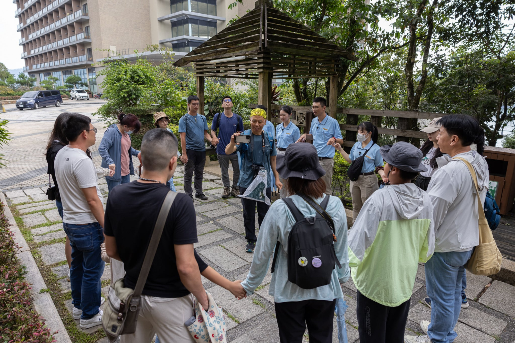 8⽉23⽇,⼩組夥伴葉⼦、變⾊龍、抖棍、海蛇與⾚⽪,陪同雲品的旅客與員⼯展開⾃然體驗活動。在正式開始前,由葉⼦帶領⼤家向⽇⽉潭的⼭神致意,透過祈願儀式為活動揭開序幕。