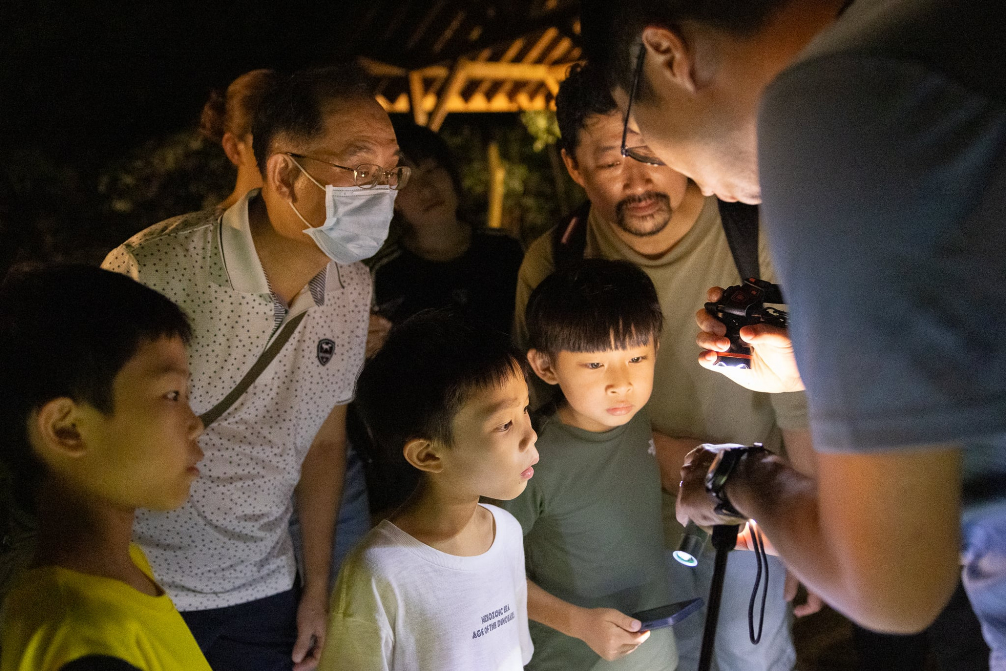 晚上7點30分,夜間⾃然體驗正式展開。由海蛇擔任開場,他先在室內向⼤家介紹夜間觀察時需要注意的事項,例如避免使⽤強光直射動物、保持安靜以免驚擾,以及如何藉由聲⾳、眼光反射或環境線索來發現牠們的⾝影。隨後,他播放了⼀張張⾃⼰過往拍攝的精彩照片,每⼀張影像都勾起眾⼈的好奇與期待,讓旅客們在正式踏出⼾外 前,早已躍躍欲試,迫不及待想要親⾃走進⿊夜,與⽇⽉潭的夜⾏⽣物相遇。
