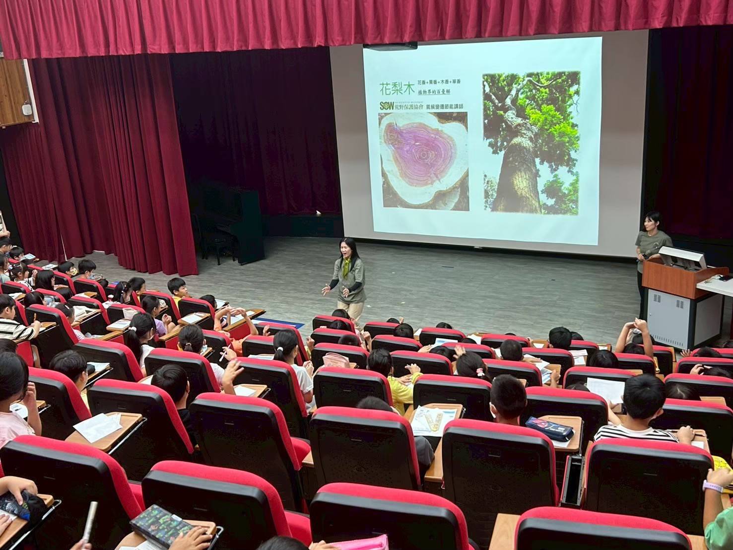 第二場在健康國小面對上百位三年級學童,我特別設計了口號與手勢互動。當全場齊喊「節能小尖兵 ready-go!」時,孩子們的熱情點亮了整個空間。有趣的是,當我分享電費計算公式時,有孩子認真表示「還沒學過除數」,卻仍努力跟讀,這份純真與專注讓人會心一笑。