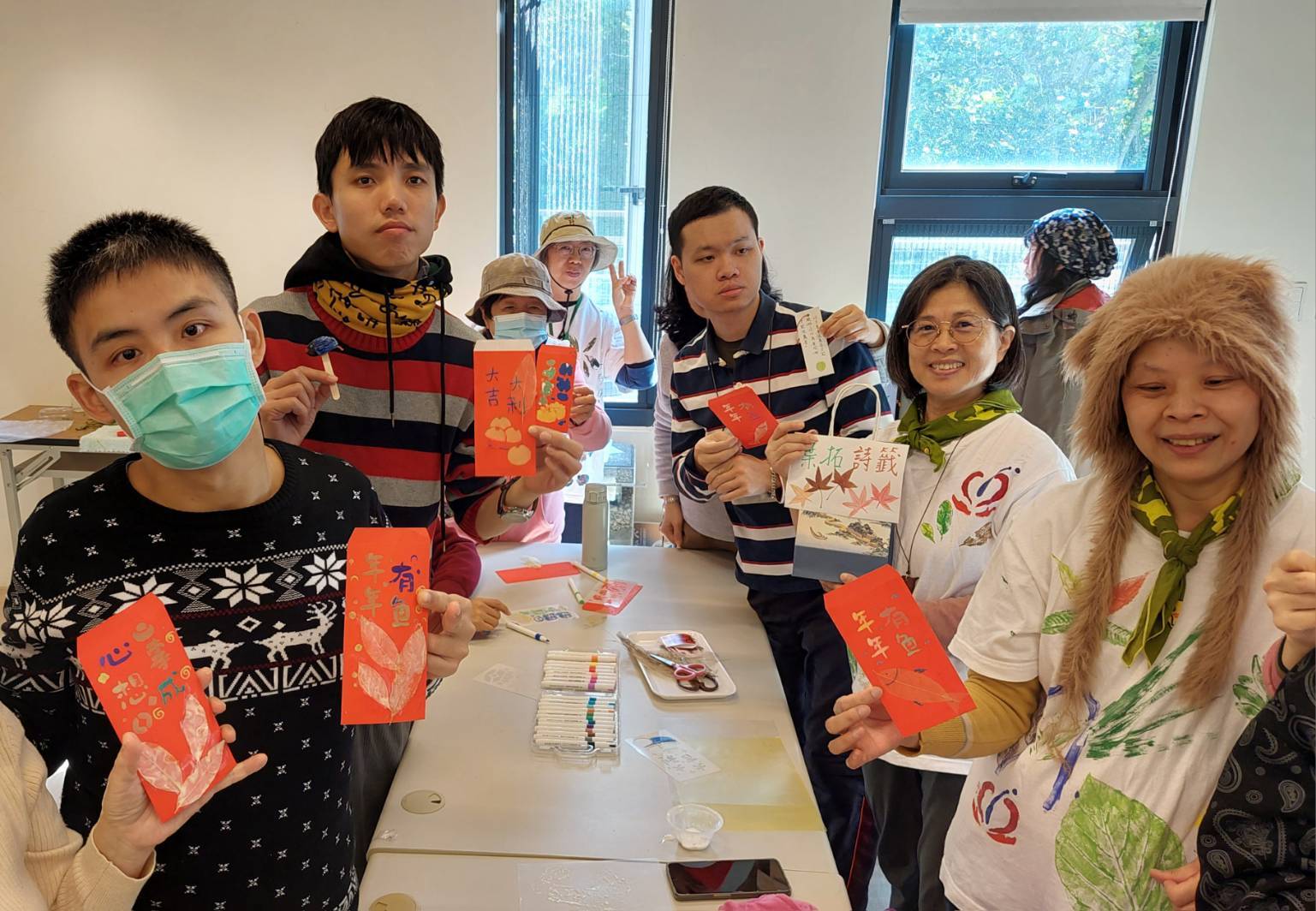 隨著農曆年節的氣氛,活動轉入靜態的藝術創作。老師準備了紅包袋與吉祥話模板,讓孩子們用壓克力筆彩繪祝福。隨著,孩子們可以挑選老師預先處理好的「葉脈」,將這些剔透的自然紋理黏貼在紅包袋上。家長們看著孩子專注描繪的神情,心中滿是欣慰。而過程中在生態問答中表現優異的星兒,更獲得了老師手繪的蘇木種子小鳥圖,那份精緻與環保兼具的禮物,讓在場所有人羨慕不已。