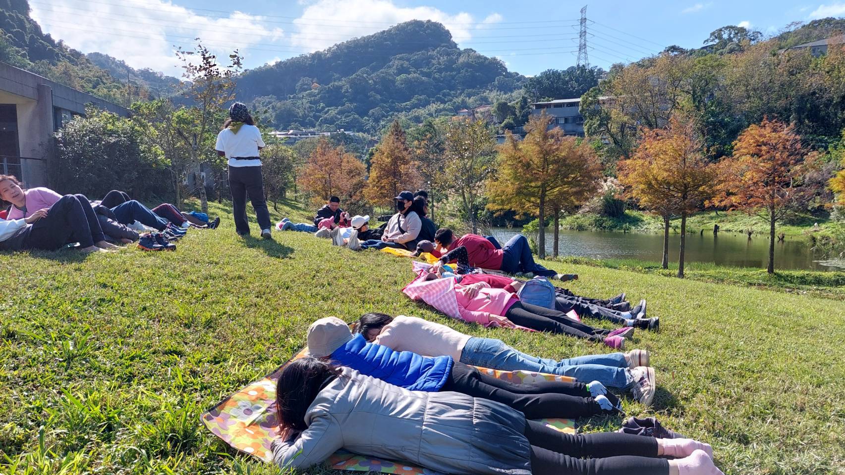 激情過後,是回歸平靜的時刻。所有人在「荒野」志工老師引導下躺在草地上,進行最後的「大休息」。暫停大腦的運轉,只留下感官的敞開。讓背部感受大地的承托,讓耳朵聆聽環境中的交響,讓眼睛收納藍天與花草樹木的精彩。