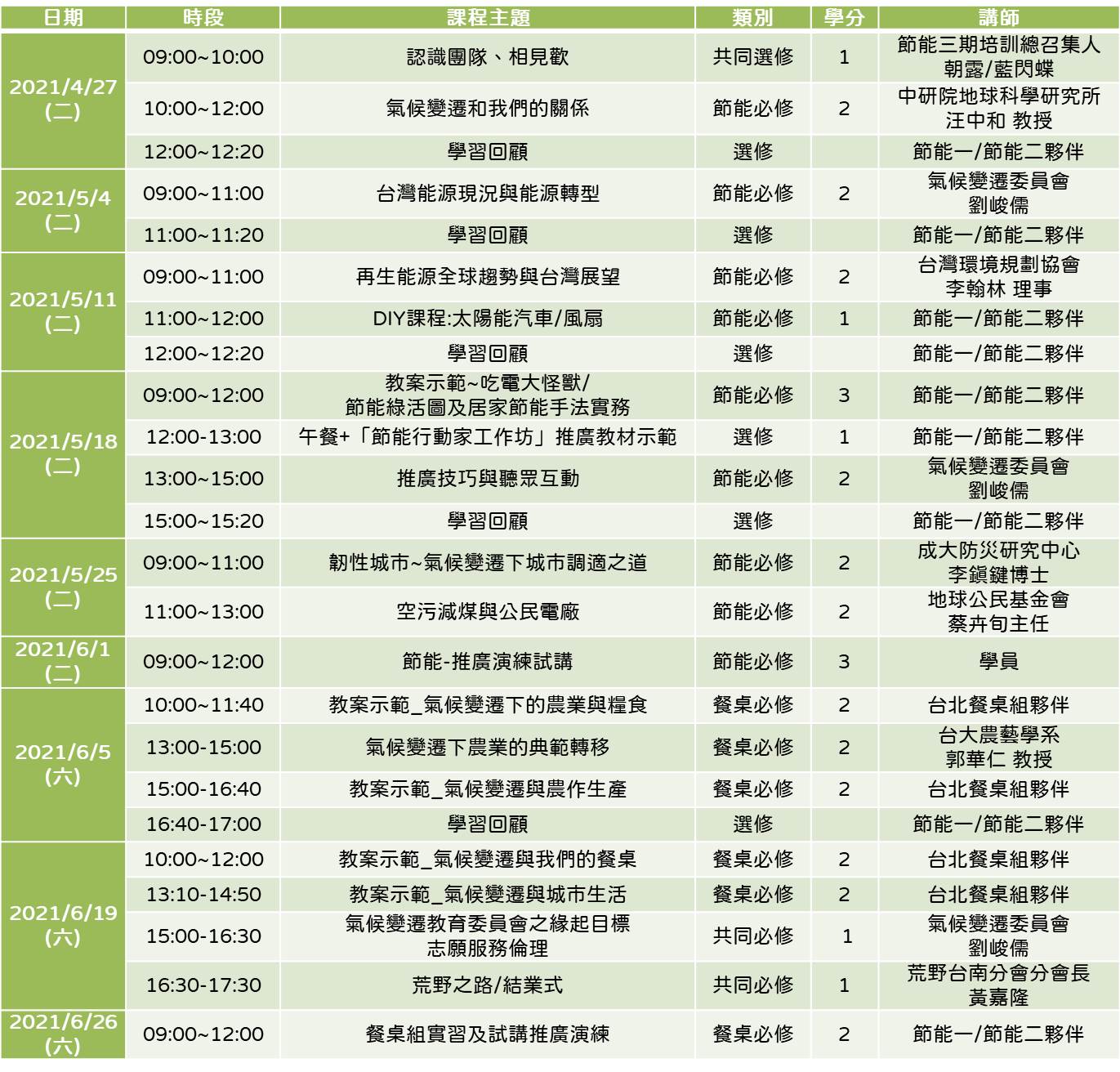 「氣候變遷節能推廣講師」及「氣候變遷餐桌推廣講師」培訓,透過實作與課程,讓我們受訓後,由自身做起並發揮影響力,進一步協助我們所愛的家人、朋友,成為減緩氣候變遷的行動家,一同努力讓我們的空氣更清新、環境更美好。