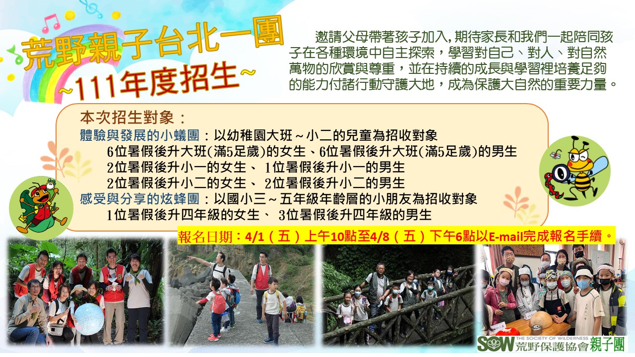 請您與您的孩子充分討論,若決定加入荒野親子團台北一團,請下載報名表及問卷 ,並於2022年4月1日(五)上午10點至4月8日(五)下午6點之間以E-mail方式完成報名手續。。