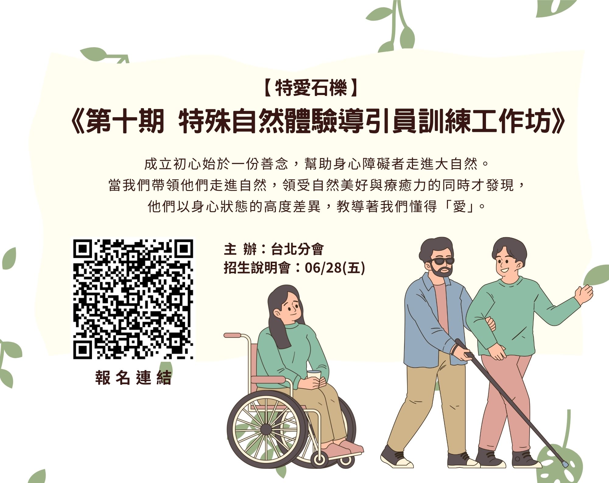 18歲以上,具備生態環境教育基礎,且願意參與協助身心障礙者走入自然環境,共享自然之美好者。名額30人 (15人以上開課)。