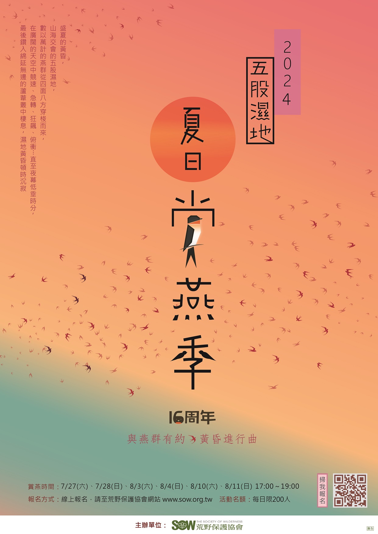 | 17:40~18:10 | 步行至賞燕區 | 沿途介紹五股濕地與荒野保護協會, 出發/到達時間將視燕群出沒時刻微調。 |