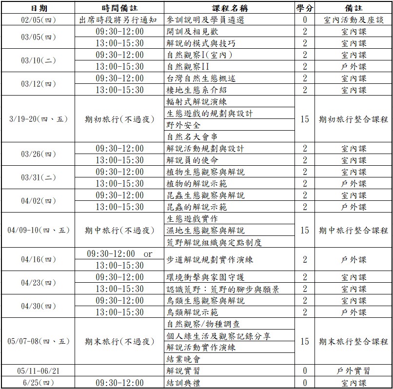 3.受訓期間(含課程及實習),須參加荒野保護協會(或其他單位)主辦且主題與訓練內容相關之解說活動至少3次,並繳交解說見習心得報告。