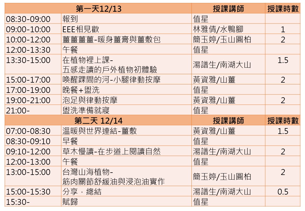 👥課程對象:上限20名。本會保留調節人數及錄取名單之權利。歡迎年滿20歲之一般民眾,冬季易冷倦、想以自然與手作調理者;對在地植物、步道學習與身體節律工作有興趣的朋友。
