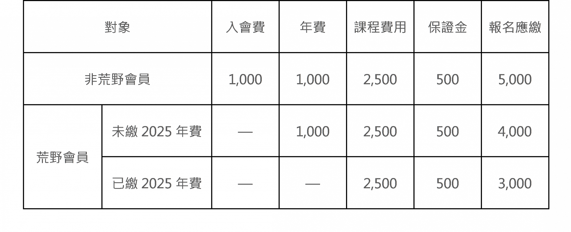 | 非荒野有效會員:(年費1000元+課程2500元+保證金500元) | NT$ 4,000 |