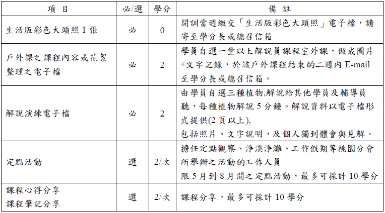 - 有關學分的計分及缺課的補學分方式由學分長於開訓時統一說明。課程結訓後,學員可取得荒野保護協會桃園分會解說員結業證書。