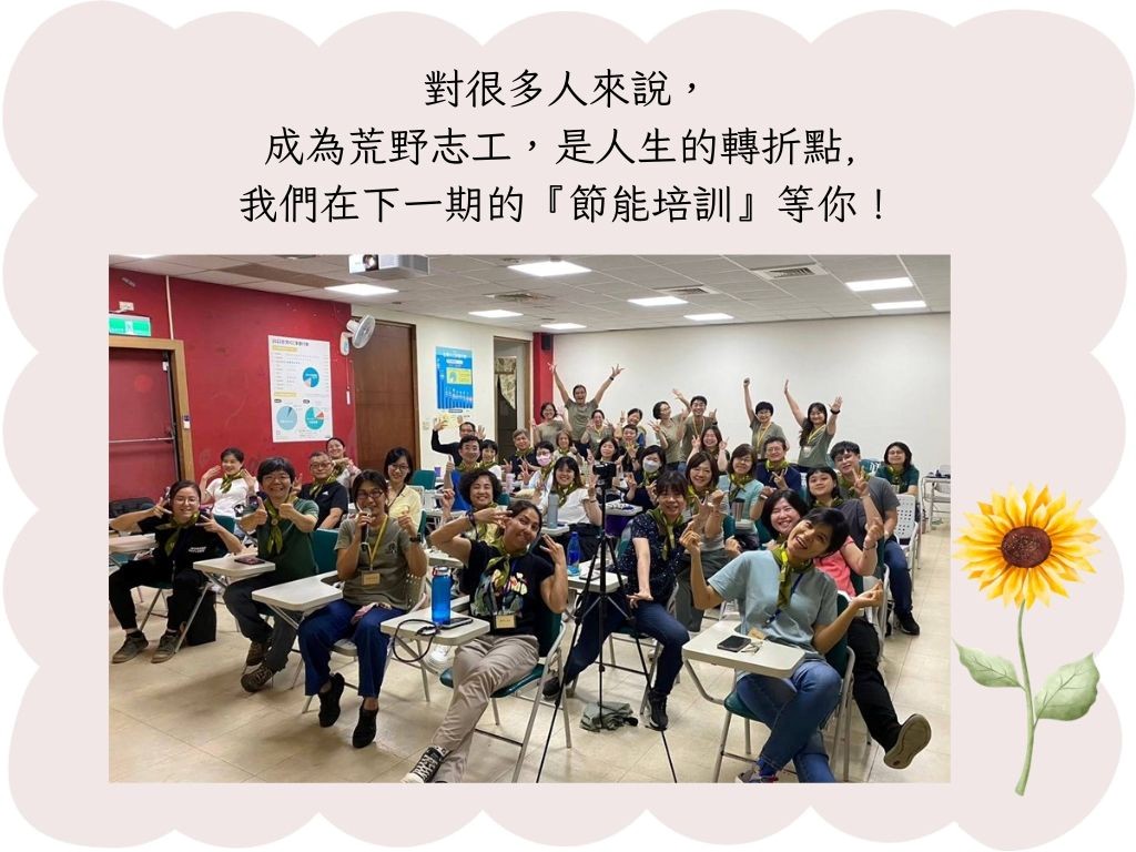 1. 學員依規定取得氣候變遷【節能講師】資格後,將代表荒野進入社區、學校、企業等場域推廣節能減碳知識,出講時間可依個人方便彈性安排。