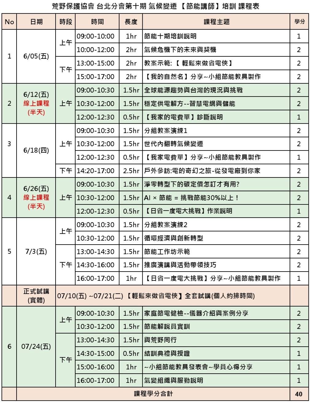 1. 實體課程四天:荒野保護協會台北分會(台北市中正區詔安街204號 B1荒野廳)