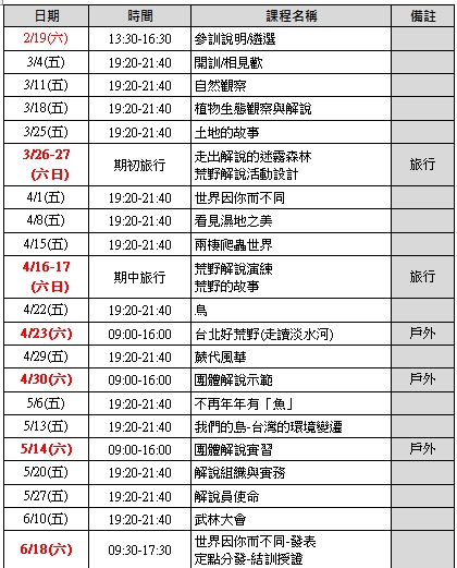 【上課地點】1. 室內課:台北市詔安街204號 荒野保護協會台北總會B1教室