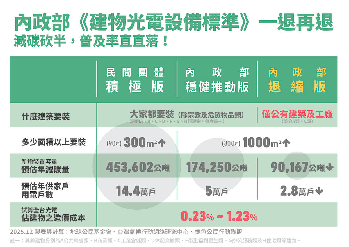 綠色公民行動聯盟研究員劉如意指出,內政部預告之草案內容,排除E類宗教類以及I類危險倉儲類,其餘建物類型皆需符合新、增、改建建物1,000平方公尺(300坪)以上,每20平方公尺(6坪)即須裝設1KW的太陽能板的規定。根據內政部估算,將佔全國新建屋頂面積總量60%、一年可供5萬戶家戶用電。若依內政部部長劉世芳11月5日所說,先適用公共建物(A類)及工廠(C類),裝設屋頂光電建物佔全國新建屋頂面積總量將從60%降至15.58%,普及性大打折扣,可供一年家戶用電數不足3萬戶,新增屋頂光電裝置容量之減碳量更是從17萬公噸降至9萬公噸。