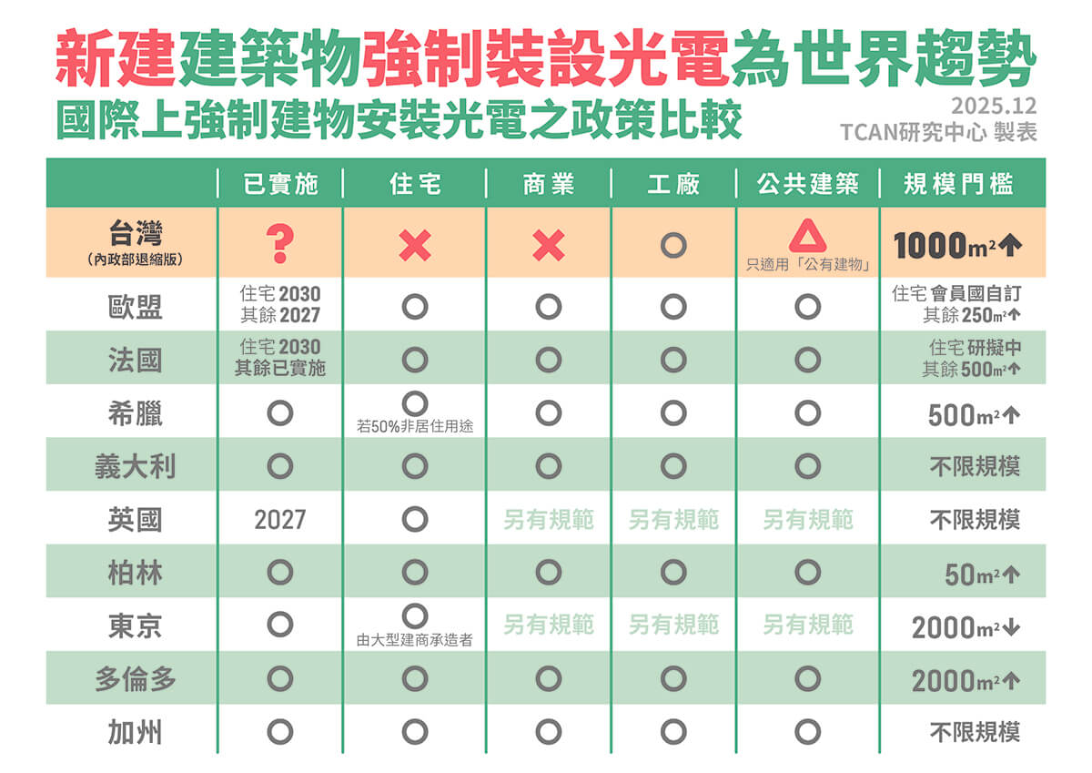 國際上,多個國家已有建物加裝光電規範,例如歐盟新版《建築能源效能指令》(Energy Performance of Buildings Directive ,EPBD)等制度,要求不同類型新建物依時程加裝屋頂光電,視之為強化能源自主、提升氣候韌性的必要基礎工程。台灣若仍停留在侷限適用範圍、分階段嘗試的保守做法,不僅不利未來建築物減碳,也恐讓台灣在淨零轉型上節節落後全球趨勢。中央各部會與地方政府更應在既有社會共識上加速協調,共同確保屋頂光電子法如期到位,讓減碳政策真正具備持續性與可信度。