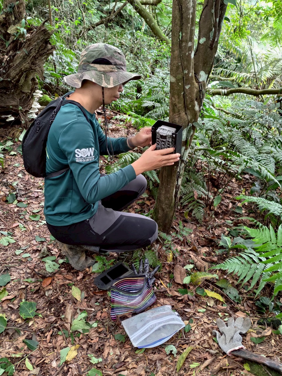 ▲ 圖 1 /360相機環景記錄棲地變化; 圖 2 /定期巡守換自動相機電池與記憶卡