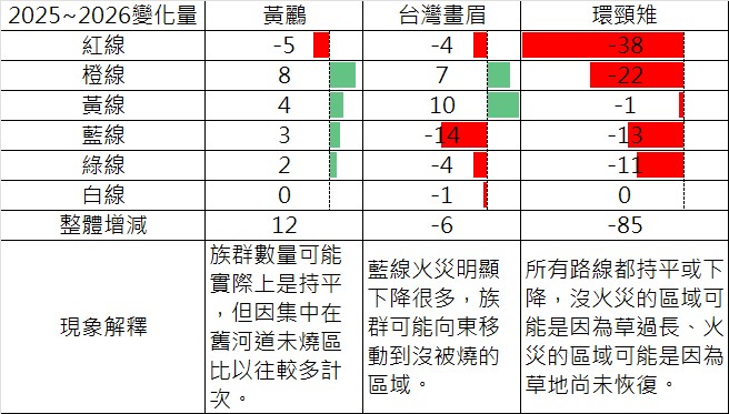 荒野臺東分會會長蘇俊榮表示:「此次調查,呈現火燒和非火燒區不同景況。環頸雉調查的數量比去年(206隻次)少了80多隻次,可能有受火災造成的草地減少、非火災區草過長影響。黃鸝所需的大樹區域不幸火災,食物、棲地減少,整體數量沒雖看起來有增加但多集中在非火災區中的舊河道。臺灣畫眉習慣在灌木叢築巢,這次一條有走進火災範圍的路線比去年少了很多,可能是因為中、底層植被減少。」