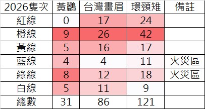 ▲ 圖/2026知本濕地繁殖鳥調查各路線隻次