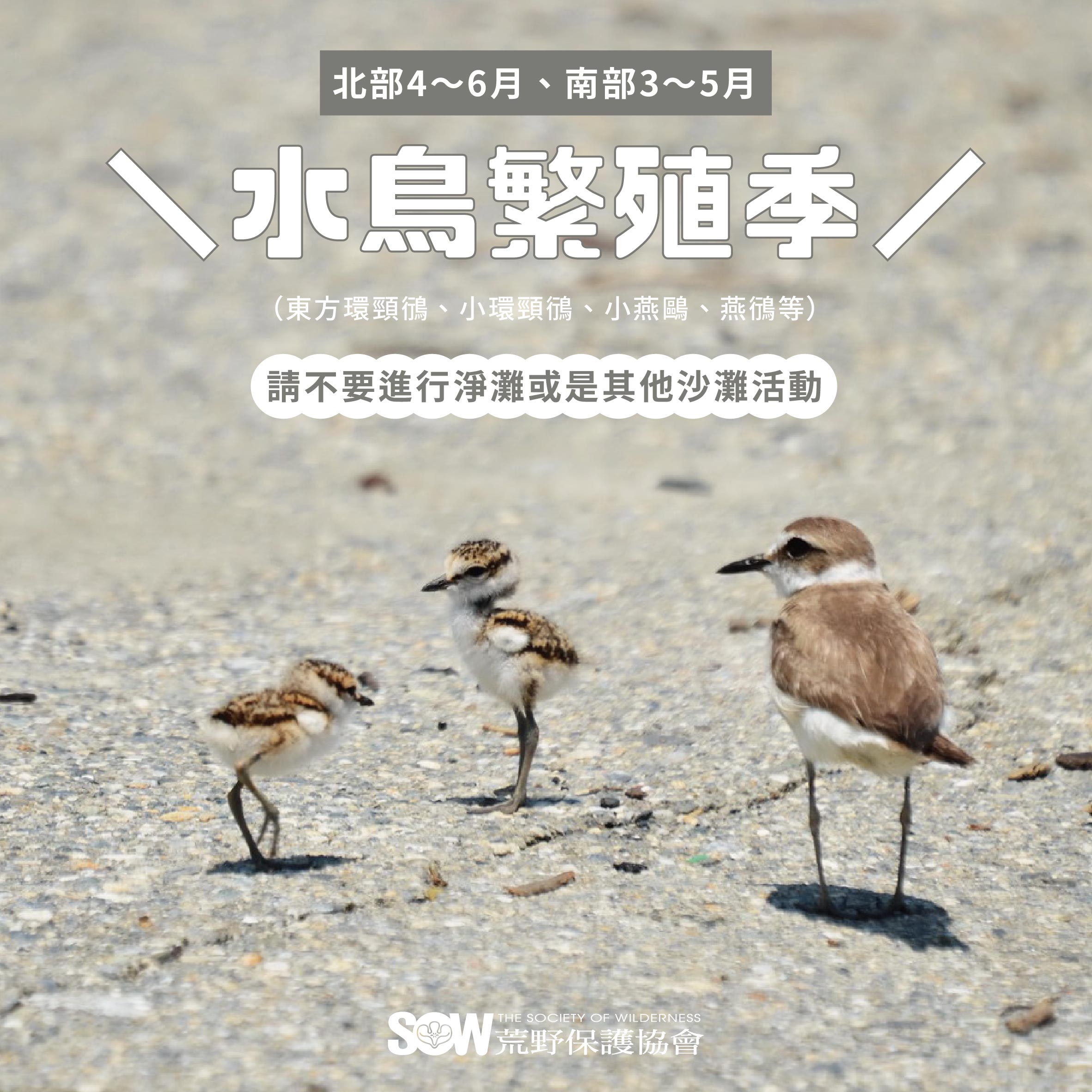 一年一度的水鳥繁殖季又來臨了,荒野持續每年與新北市政府的共同宣導,愛海、敬海的同時也要關心沙灘地形上的其他生物,呼籲國人應避開敏感的水鳥繁殖地,暫停於沙灘上辦理大型淨灘活動(北部4~6月、南部3~5月),避免不小心干擾了水鳥的繁殖與育雛。同時今年為了讓國人能更加同理「水鳥護生」的意義,特別安排於「母親節」前一天辦理護生圍籬的施作,由荒野台北分會的志工們齊心努力,頂著大太陽完成施作,期望在溫馨的母親節也能讓水鳥媽媽安心照顧鳥寶寶。